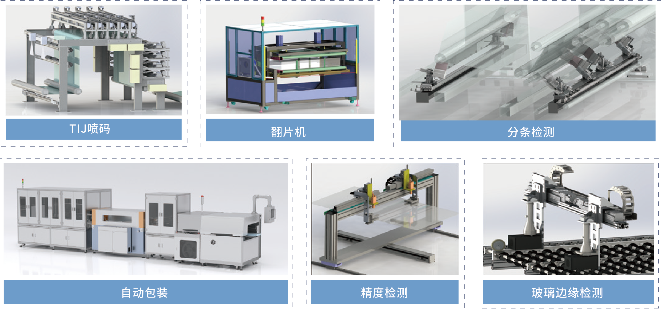 TIJ喷码、翻片机、分条检测、自动包装、精度检测、玻璃边缘检测