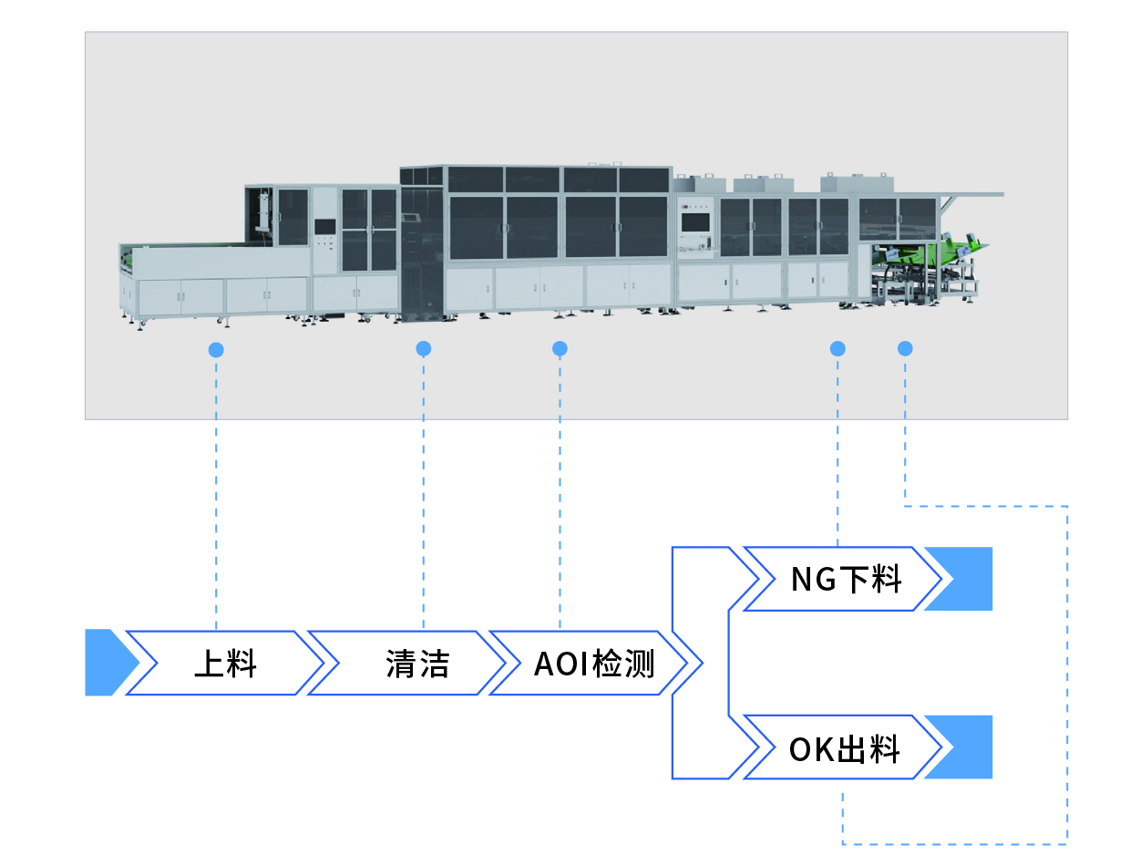 设备用于偏光片的检测,采用自动上下料以及特制输送结构,搭配自研AOI检测软件,对矢印章、缺陷打标Mark、异物、气泡、划伤、凹凸点、折痕、撞伤、残胶、脏污等缺陷进行精准检测以及OK/NG分流,把控出货产品质量。